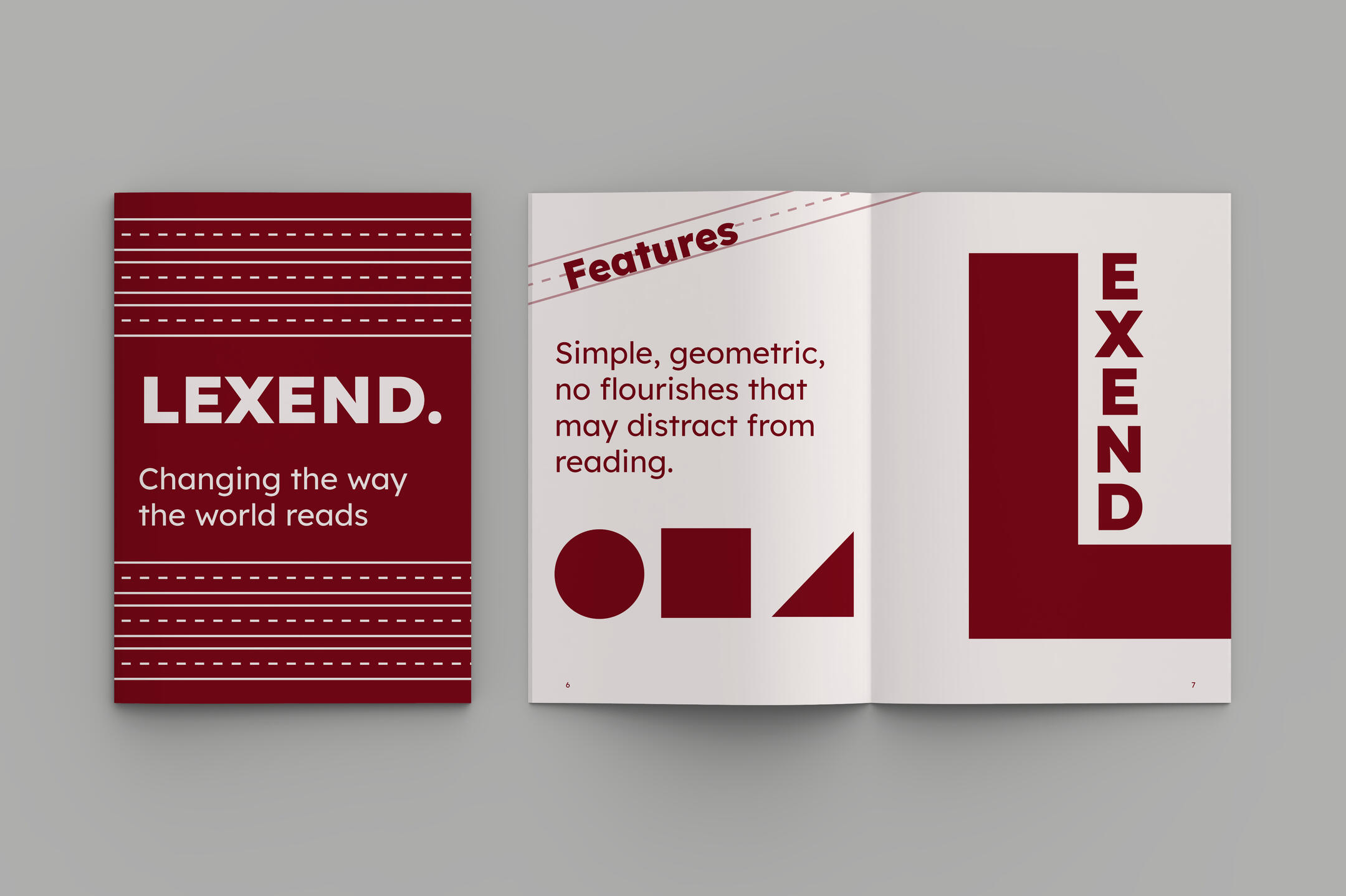 The typeface’s introductory website and logo use a bright red and white. I wanted to pay homage to it, but darkened the red to create higher colour contrast and added a slightly red tint to the white to make it less harsh on the eyes than pure white.The decision to incoporate minimal graphics was made to allow for there to be more breathing room for the typeface. I used simple shapes to symbolize the geometric nature of the type design.