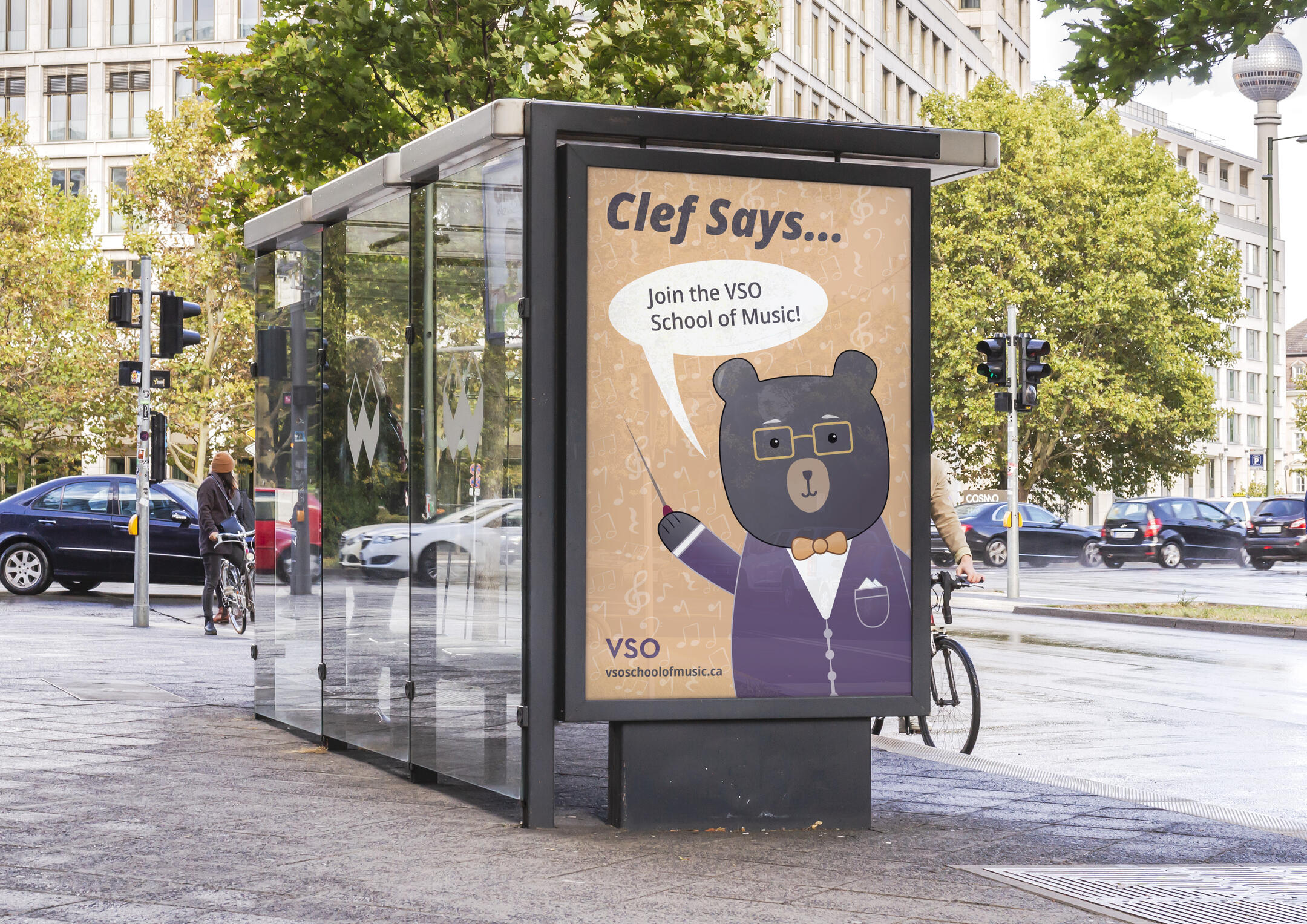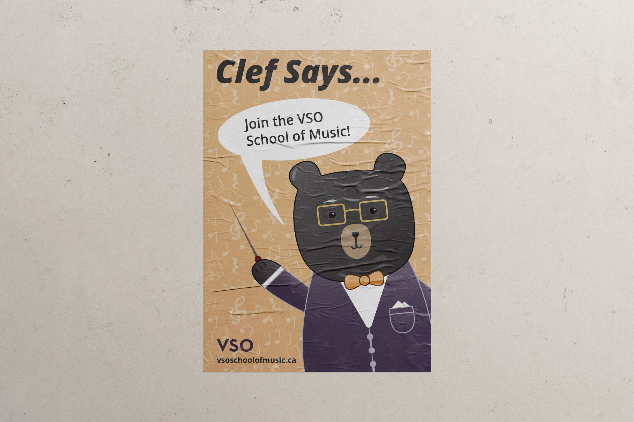 sophistication and education that is associated with classical music.Paired with an orange tint for the bow-tie and poster background, which represents youthfulness, the poster and Clef become more friendly and social—hopefully inviting viewers to look into and join the VSO School of Music.